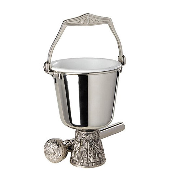 Bénitier et goupillon en laiton plaqué argent, base du bénitier avec motif de la Dernière Cène. Bénitier hauteur 17cm (6,5''), diamètre 12cm (4,5''). Goupillon longueur 20,5cm (8'').