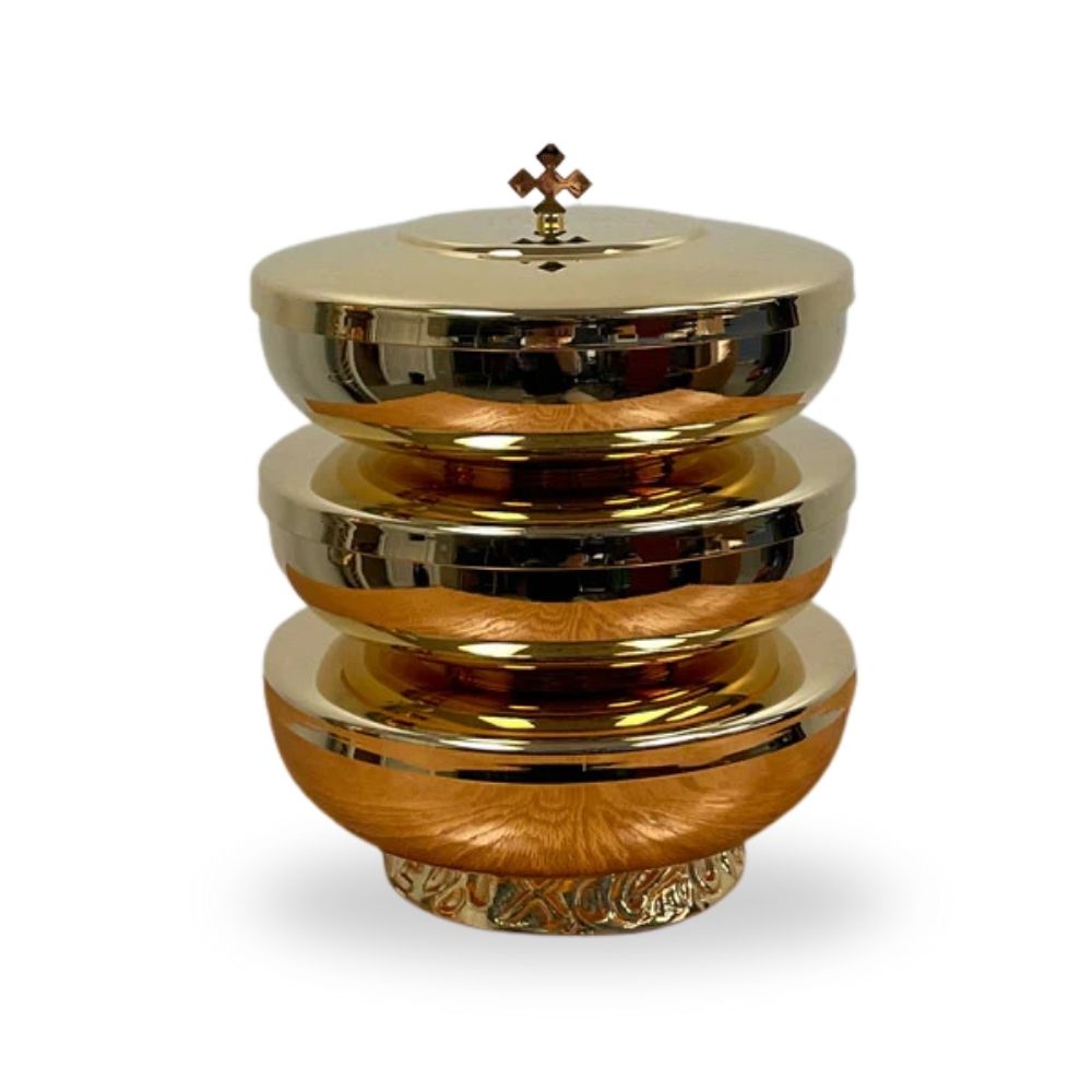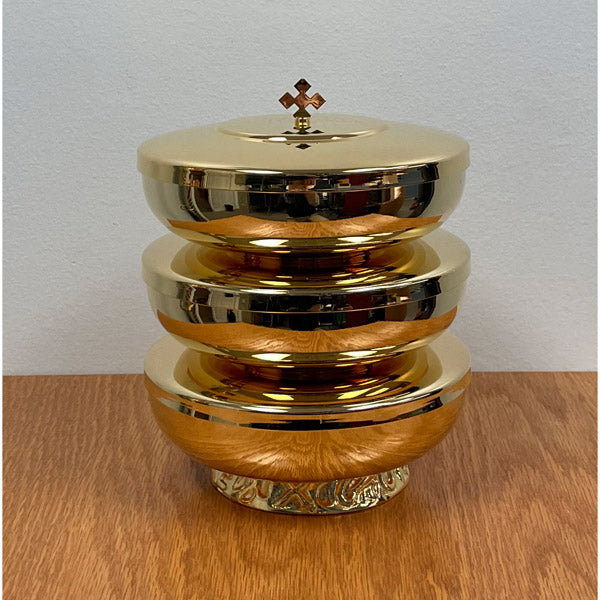 Ensemble de trois ciboires empilables en laiton plaqué or. Hauteur 18 cm (7''), diamètre 15 cm (6'').