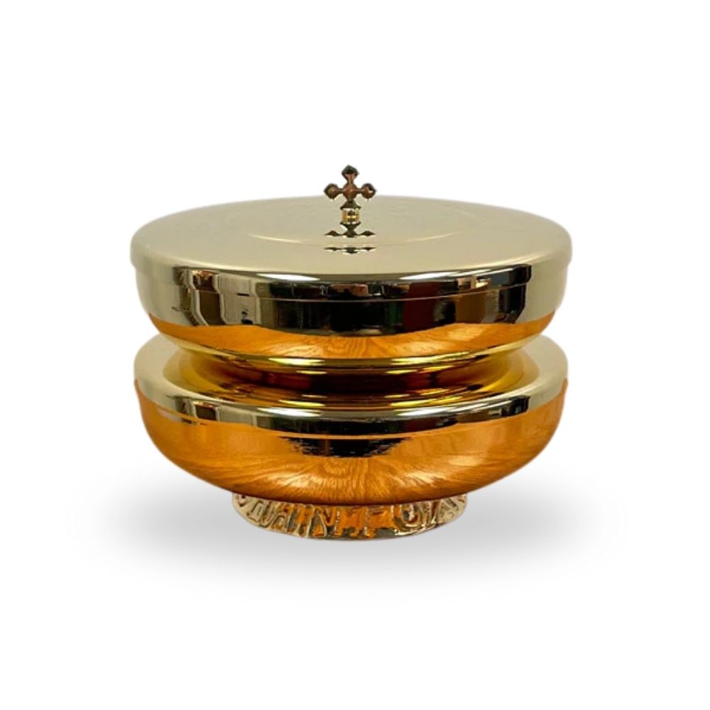 Ensemble de deux ciboires empilables en laiton plaqué or. Hauteur 13 cm (5''), diamètre 17 cm (6,5'').